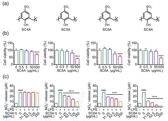 (a) Structure of SC4A, SC5A, SC6A, and SC8A; (b) viabilities of BV2 cells treated with SC4A, SC5A, SC6A, SC8A for 24 h (* p < 0.05, ** p < 0.01, **** p < 0.0001); (c) measurement of NO generation by Griess assay. BV2 cells culture medium was added with LPS (0.1 μg/mL) alone, LPS (0.1 μg/mL) with SC4A, SC5A, SC6A, SC8A for 24 h, respectively. Cells cultured without LPS (0.1 μg/mL) and calixarenes served as the control group. #### p < 0.0001 vs. the control group; **** p < 0.0001 vs. the LPS group.