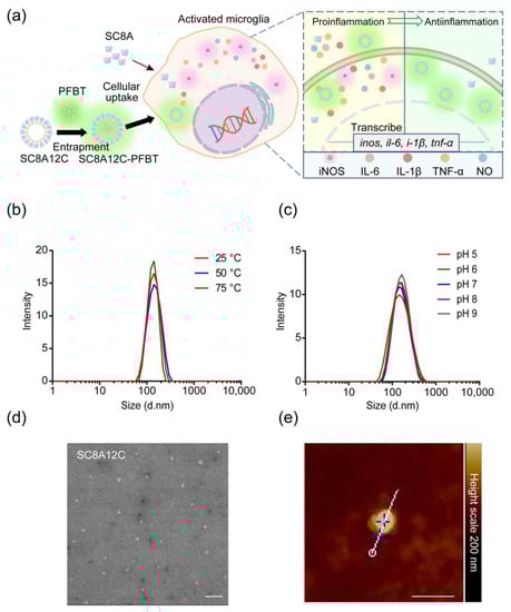 (a) Schematic diagram of SC8A or SC8A12C assemblies for inflammatory treatment. SC8A or SC8A12C-PFBT entered microglia to inhibit the expression of iNOS and the release of inflammatory mediators; (b) effect of temperature on the size of SC8A12C assemblies (25 μg/mL) in water; (c) effect of pH on the size of SC8A12C assemblies (25 μg/mL) in water; (d) TEM image of SC8A12C assemblies. Scale bar, 500 nm; (e) AFM image of SC8A12C assemblies. Scale bar, 500 nm.