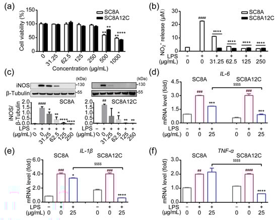 (a) Viabilities of BV2 cells treated with SC8A, SC8A12C for 24 h (** p < 0.01, **** p < 0.0001). (b) Measurement of NO generation by Griess assay. BV2 cells culture medium was added with LPS (0.1 μg/mL) alone, or LPS with SC8A, SC8A12C for 24 h, respectively. Cells cultured without LPS and calixarenes served as the control group. (c) Representative and quantitative Western blot results, in which the lanes represent the iNOS or β-tubulin level in the cell sample as shown above, illustrating that SC8A and SC8A12C significantly attenuated LPS-induced increases in iNOS expression. (d–f) RT-qPCR analysis proving the inhibitory effect of SC8A, SC8A12C on the transcription of LPS-induced proinflammatory genes in BV2 cells. ## p < 0.01, ### p < 0.001, #### p < 0.0001 vs. the control group; * p < 0.05, ** p < 0.01, *** p < 0.001, **** p < 0.0001 vs. the LPS group; $$$$ p < 0.0001 vs. the SC8A group.