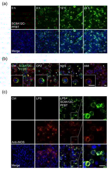 The self-assemblies formed by amphiphilic calixarenes provide a macrocyclic cavity and micelle interior, which enable drug solubilization. Drugs can either be complexed into macrocyclic cavities, be solubilized into micelles self-assemblies, or both, suggesting the potential application of amphiphilic calixarenes as drug delivery systems []. To investigate the drug-loading capacity of amphiphilic calixarenes, we co-assembled SC8A12C with a fluorescent probe, poly[(9,9-dioctylfluorenyl-2,7-diyl)-alt-(benzo[2,1,3]thiadiazol-4,7-diyl)] (PFBT) to form SC8A12C-PFBT and observed the cell uptake of the SC8A12C assemblies (Figure 2a). We examined the effect of SC8A12C-PFBT on NO production at the non-toxic concentration (Figure S3), and the results suggested that the loading of PFBT into the cavity of SC8A12C did not affect the inhibitory effect on LPS-induced NO production in BV2 (Figure S4). Meanwhile, the inhibitory effects of SC8A12C-PFBT on iNOS protein expression, as well as the mRNA transcription levels of inflammation-related genes, were consistent with the above findings of SC8A12C (Figures S5–S8). Notably, we found that the cellular uptake reached a peak at 12 h after SC8A12C-PFBT treatment and maintained considerably high fluorescent accumulation for at least 24 h (Figure 4a). Then, we studied the internalization mechanism of the SC8A12C assemblies (Figure 4b). Fluorescence imaging demonstrated that amiloride, a macropinocytosis inhibitor, restricted the internalization of SC8A12C. However, clathrin-mediated endocytosis inhibitors (chlorpromazine) and caveolin-mediated endocytosis inhibitors (nystatin) had no effect on cell uptake. We found that macropinocytosis played a crucial role in the uptake of SC8A12C assemblies in a microglia cell line. In addition, most iNOS-positive cells were co-localized with the SC8A12C-PFBT positive cells (Figure 4c). Accordingly, these results indicated that SC8A12C was prone to self-assembly, and these assemblies with nano-size are capable of either permeating, accumulating, or both, into the microglia to suppress neuroinflammation; the cell uptake of SC8A12C loaded with PFBT also showed that the SC8A12C assemblies are capable of drug loading and drug delivery.