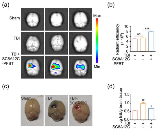 Inspired by the in vitro effects of SC8A12C against LPS-induced neuroinflammation, we next performed an in vivo study on SC8A12C. TBI refers to soft tissue, skull, and brain tissue injuries, often caused by combat, falls, traffic accidents, and sports activities, which have fairly high morbidity and mortality worldwide []. The primary injury rapidly stimulates microglial cells to a hyperinflammatory state, which further produces a fulminant cytokine storm that eventually causes irreversible brain damage. Therefore, targeting neuroinflammation is an excellent strategy for treating TBI [,,]. However, a rare approach is currently managed in the immediate intervention after primary insults. Locally delivered agents must be developed as a practical strategy for emergency rescue to avoid the difficulty of crossing the blood-brain barrier (BBB). We administered SC8A12C to the exposed brain tissue with an eyedropper. To estimate the brain level of SC8A12C, we performed a fluorescence analysis to observe the SC8A12C-PFBT fluorescence in the mouse brain at 24 h of administration (Figure 5a,b). We found that the assemblies penetrated into the brain parenchyma. We next explored the potential therapeutic effects of SC8A12C on BBB recovery, inflammatory inhibition, and functional recovery. The inflammatory response associated with TBI results in the damage of the BBB []; hence, the repair of the BBB is likely to improve neurological function and brain recovery []. Evans Blue (EB) staining was used to detect the damage degree of the BBB []. The BBB permeability of mice in a TBI group was significantly increased, which indicated cerebrovascular injury had occurred (Figure 5c). Surprisingly, a single administration of SC8A12C remarkably decreased EB extravasation, which was in accordance with the quantification analysis in different groups (Figure 5d). The above results demonstrate that calixarene assemblies have the ability to penetrate deeply into the brain parenchyma, which proves that they have the potential to exert biological function in the brain.