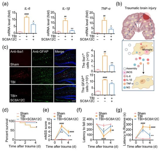 (a) RT-qPCR quantitative analysis of IL-6, IL-1β, TNF-α levels in the injured cortex at 1-day post-injury of sham mice, TBI mice with or without SC8A12C treatment (n = 3); (b) schematic diagram of SC8A12C treating TBI by inhibiting microglia activation; (c) fluorescence images and counting of Iba+ and GFAP+ cells in the penumbral regions of brain slices from sham, TBI, and TBI + SC8A12C groups (n = 3). Scale bar, 50 μm; (d) survival rates of sham mice, and TBI mice with or without SC8A12C administration (n = 6) during 4 days; (e) the mNSS test at 1 and 4 days post-injury in sham mice, TBI mice with or without SC8A12C administration (n = 6); (f) rotarod analysis of motor function at 1, 4 days post-injury in sham mice, TBI mice with or without SC8A12C administration (n = 6); (g) the adhesive tape removal test, the latency to remove for ipsilateral forepaw was evaluated at 1 and 4 days post-injury in sham mice, TBI mice with or without SC8A12C administration (n = 6). # p < 0.05, ## p < 0.01, #### p < 0.0001 vs. sham group; * p < 0.05, ** p < 0.01 vs. TBI group.