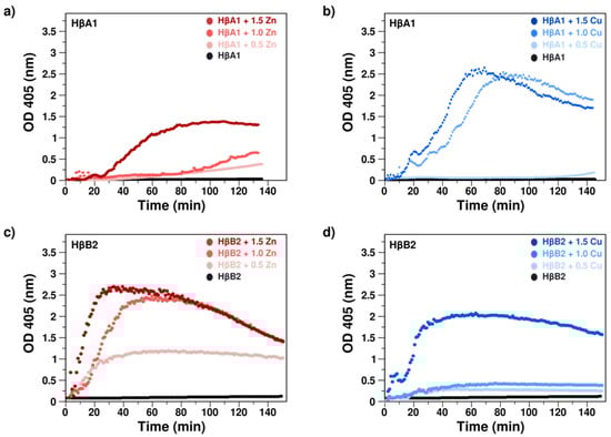 Effect of Zn(II) and Cu(II) as reported by turbidity assays at 37 °C. Absorbance at 405 nm as function of time for (a) HβA1 in the absence (black) and presence of 0.5, 1, and 1.5 equivalents of Zn(II) (red gradient); (b) HβA1 in the absence (black) and presence of 0.5, 1, and 1.5 equivalents of Cu(II) (blue gradient); (c) HβB2 in the absence (black) and presence of 0.5, 1, and 1.5 equivalents of Zn(II) (red gradient); (d) HβB2 in the absence (black) and presence of 0.5, 1, and 1.5 equivalents of Cu(II) (blue gradient). The change in absorbance is due to the formation of aggregates that scatter the light.