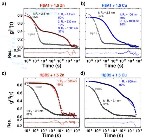 Metal-induced aggregates were further analyzed by dynamic light scattering (DLS) to measure changes in sizes induced by the ions. As a reference, we calculated the hydrodynamic translational diffusion coefficient predicted by the Hullrad [] software from the face-en-face dimer models. It should be mentioned that the structural models do not include the extension at the beginning of the N-terminal domain or at the end of the C-terminal domain. The hydrodynamic radius (RH) and the translation diffusion coefficients obtained were RH~2.7 nm and D~7.9 × 10−7 cm2/s for HβA1 and RH~2.6 nm and D~8.1 × 10−7 cm2/s for HβB2.