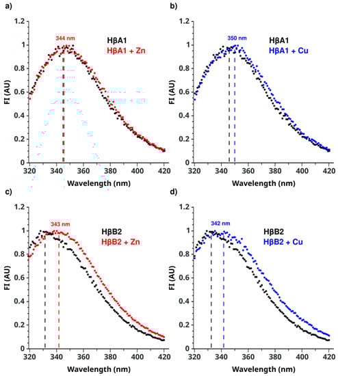 Normalized Intrinsic fluorescence. (a) HβA1 in the absence of metal ions (black) and in the presence of Zn(II) (red). (b) HβA1 in the absence of metal ions (black) and in the presence of Cu(II) (blue). (c) HβB2 in the absence of metal ions (black) and in the presence of Zn(II) (red). (d) HβB2 in the absence of metal ions (black) and in the presence of Cu(II) (blue). The emission spectrum was recorded in the range of 300 and 500 nm using an excitation wavelength of 295 nm at 37 °C. (Replica spectra are shown in Figure S7).