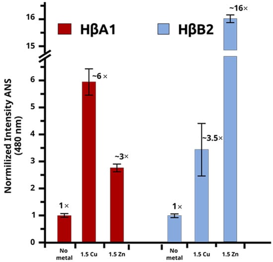 Contrary to the results obtained with Trp fluorescence, an increase in ANS fluorescence ~3 times greater than in the native protein for HβA1 with Zn(II) was observed. For Cu(II), the increase in ANS fluorescence was even larger, with ~6 times more intensity than in the native folded protein.