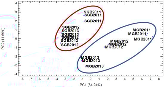 The scatter plot of distribution compounds of studied brandies: Muscat grape brandy (MGB) and standard grape brandy (SGB) for three consecutive vintages.