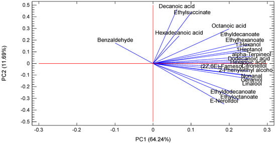 Aromatic volatile compounds (alcohols, volatile acids, volatile esters, terpenes, volatile aldehydes, and acetals) are important sensory indicators and quality parameters for alcoholic beverages []. The varietal aroma potential of grapes is one of the most important factors determining the brandy’s character, quality, and typicity, particularly in Muscat-based brandies [].