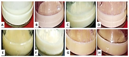 Texture of the Cedrela odorata essential oil (10%) and water (75%) mixture after their emulsification with different mixtures (15%) of the surfactants Tween 80 and Span 20. Hydrophilic–Lipophilic Balance (HLB) value of the surfactant mixtures: (A) 8.98; (B) 10.01; (C) 10.46; (D) 10.78; (E) 11.03; (F) 11.48; (G) 12.06; and (H) 12.89.