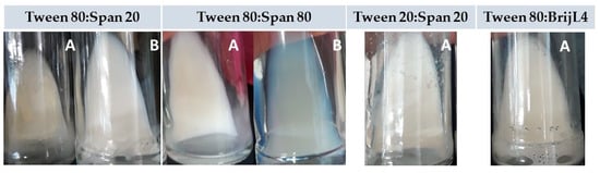 Emulsification of the C. odorata EO was carried out with binary mixtures of HLB = 10.46 prepared with non-ionic surfactants (TW80, TW20, SP80, SP20, and BL4), and the following components: EO, surfactants, and water at a ratio of 10:15:75. The evaluation of the different mixtures of surfactant agents was carried out in order to select the most suitable mixture to encapsulate the C. odorata oil []. Surfactants TW80, TW20, SP80, and SP20 are recommended for making emulsions using high-energy methods, and BL4 is suggested when low-energy methods are applied []. The HLB of these surfactants corresponds to those suggested for preparing emulsions of the O/W type, or W/O, as in the case of the SP20. Figure 3 shows the appearance of the emulsions formed during the two stages of the process implemented to develop the nanoemulsion. The letter A identifies the emulsions formed in one stage (magnetic stirring with heating), while the letter B represents the emulsions formed in two stages (magnetic stirring with heating and ultrasound in cycles of 2 min). The surfactant mixtures generated emulsions with the following characteristics.
