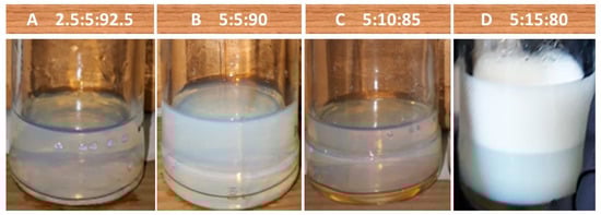 The emulsions (or nanoemulsions) of the different stages were prepared in 15 g batches in 100 mL bottles [,]. Surfactants previously weighed on an analytical balance (OHAUS Explorer Pro EP214C, Parsippany, NJ, USA) were mixed for 10 min with stirring at 1000 rpm, at a controlled temperature of 40–45 °C (Mr Hei-Tec, Heidolph, Schwabach, Germany). Subsequently, the C. odorata EO was added slowly for its incorporation into the mixture of surfactants for 10 min; this operation was conducted under the same stirring and temperature conditions. The water was integrated into the oily mixture at 1400 rpm at a controlled temperature of 73–75 °C; this operation lasted 30 min. The emulsion formed was analyzed with regard to the phase number, turbidity, and color. Milky emulsions, or emulsions with separate phases, were ultrasonicated (Hielscher model UP200Ht ultrasound implemented with a 7 mm sonotrode, Teltow, Germany) in cycles of 2 min until a transparent bluish emulsion was observed []. More than five cycles was an indicator that the nanoemulsion would not form.
