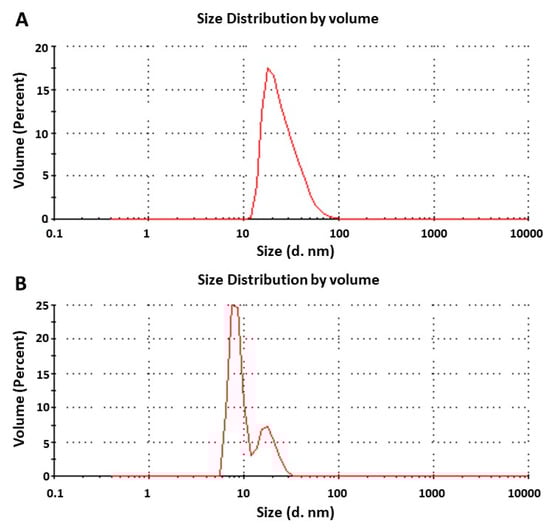 Dynamic light scattering (DLS) diagrams of the droplet diameter in the nanoemulsions: (A) 2.5:5:92.5; and (B) 5:10:85.
