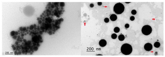 Transmission electron microscopy (TEM) morphology of the micelles in the nanoemulsion of the Cedrela odorata essential oil. The red arrows show the predominant droplet diameter in the DLS analysis at day 30 in samples stored at 5 ± 2 °C.