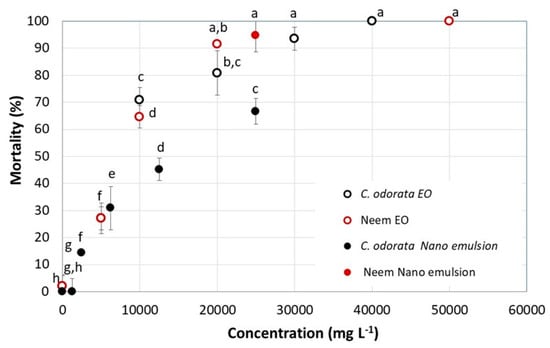 Mortality (mean (%) ± SE) of first-instar larvae of Spodoptera frugiperda measured by the effect of the concentration (mg kg−1) of the Cedrela odorata essential oil, alone or in a nanoemulsified formulation. Mortality was recorded on day seven. Positive control: neem essential oil; negative control: Tween 80–Span 80 surfactant mixture. Two-way ANOVA. Dots with the same letter (a–h) do not significantly differ (Bonferroni test for an α = 0.05).