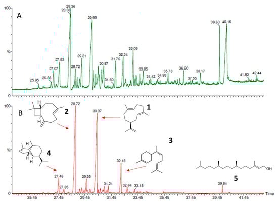 Chromatograms of the Cedrela odorata essential oil: (A) oil extracted with dichloromethane from the nanoemulsion of the C. odorata essential oil at 2.5%; and (B) oil extracted by hydrodistillation from the C. odorata dehydrated leaves. Major components: 1 = germacrene D; 2 = caryophyllene; 3 = cis-α-bisabolene; and 4 = copaene, 5 = phytol.