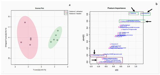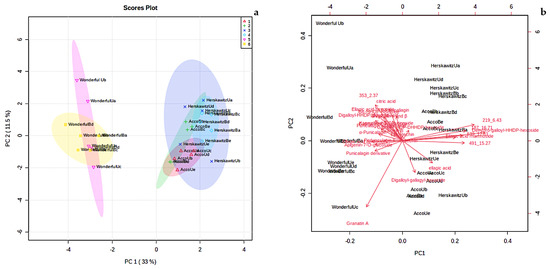 (a) Principal component analysis (PCA) score plot showing variation of P. granatum L. fruit peel from three different cultivars blanched at 80 °C for 3 min, i.e., ‘Acco’ unblanched (red colour), ‘Acco’ blanched (green colour), ‘Herskawitz’ unblanched (blue colour), ‘Herskawitz’ blanched (cyan colour), ‘Wonderful’ unblanched (purple colour), and ‘Wonderful’ blanched (yellow colour) peel extracts; (b) Principal component analysis (PCA) biplot showing the compounds that influenced the differentiation of collections into distinct clusters.