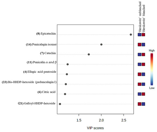 For further analysis of the significant metabolites, a “variable importance in projection” (VIP) score was constructed (Figure 4). The value of a VIP score that is equal to or greater than 1 (VIP score ≥ 1) is the typical rule for selecting relevant variables or statistically important metabolites [40]. The VIP score in Figure 4 showed that ‘Herskawitz’ blanched peel extracts had the highest relative abundance of epicatechin, catechin, punicalin α and β, and citric acid, while punicalagin isomer, ellagic acid pentoside, bis-HHDP-hexoside (pedunculagin I), and galloyl-HHDP-hexoside were down-regulated as a result of blanching. The VIP plot, score plot, and biplot for the other two cultivars with their treatments (‘Acco’ unblanched, ‘Acco’ blanched, ‘Wonderful’ unblanched, and ‘Wonderful’ unblanched peel samples) are included in the Supplementary Data (Figures S3 and S4).