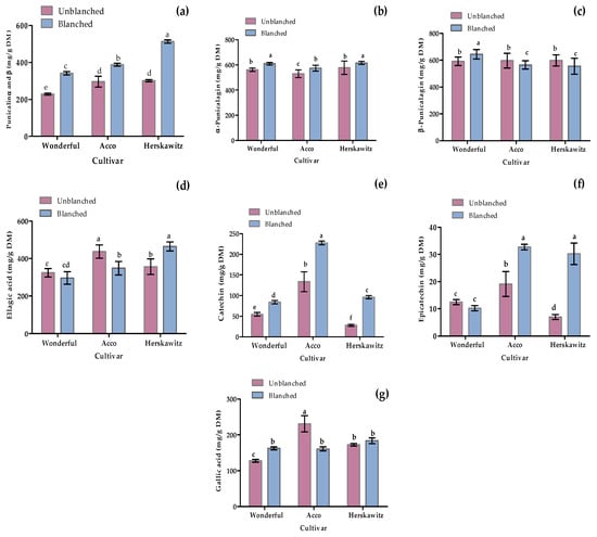 Individual phenolic and flavonoid concentration from three different cultivars, namely ‘Wonderful’, ‘Acco’, and ‘Herskawitz’ pomegranate peel at ripe harvest maturity blanched at 80 °C for 3 min. Graphs represent concentrations in mg/g DM for (a) punicalin α and β; (b) α-punicalagin; (c) β-punicalagin; (d) ellagic acid; (e) catechin; (f) Epicatechin; and (g) gallic acid. Bars with different letter(s) represent statistical differences (p < 0.05) using Duncan’s multiple range test.