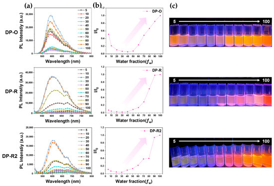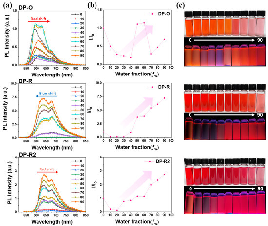 (a) PL spectra, (b) intensity change of maximum emission wavelength, and (c) photographs by water fraction (fw) of DPP-based AIE dyes. (Excitation wavelength = 365 nm).
