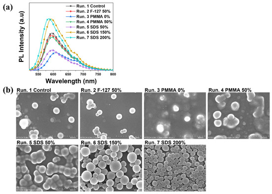 In this study, AIE NPs were produced via the emulsion–solvent evaporation method using an ultrasonicator. A schematic illustration of this method is shown in Figure 2. Pluronic F-127, a biocompatible polymer, is an amphiphilic triblock copolymer that includes hydrophilic and hydrophobic moieties. The hydrophobic part of the polymer wrapped around the AIE dyes to form micelles with hydrophilic exteriors. First, to optimize the PL intensity and shapes of the AIE NPs, PL spectra and SEM images of AIE NPs prepared with different content ratios (Table 1) were compared, using DP-O as the representative fluorescent dye (Figure 3). Pluronic F-127 was essentially used because it allows AIE NPs with high water dispersibility. The appropriate particle shapes could not be obtained without using the surfactant SDS. The Run 2 sample, with a 50% reduction in Pluronic F-127, and the Run 4 sample, with a 50% reduction in PMMA, did not exhibit significantly different PL intensities and particle shapes compared to a control, Run 1 sample. The Run 3 sample, for which PMMA was not used, showed the greatest reduction in PL intensity because, although some particles were formed, sufficient particle formation was not induced due to the lack of the PMMA for binding. In the case of the Run 5 sample, for which the SDS content was reduced by 50% with respect to the Run 1 sample, many particles were aggregated, and the PL intensity was decreased with respect to that of the Run 1 sample. It is thought that the average size of particles increased with aggregation because of the reduced amount of surfactant, and hence the ACQ effect dominated [33]. By comparison, for the Run 6 sample, for which 150% of the SDS content of the Run 1 sample was used, the particles showed very distinct shapes because a sufficient amount of surfactant was used; further, these particles were monodisperse and had the highest PL intensity. The PL intensity of the Run 7 sample, with 200% of the SDS content of the Run 1 sample, was not significantly different from that of the Run 6 sample, but a decrease in the average particle size was confirmed from the SEM image, and hence blue shift was observed. Thus, in descending order, the PL intensities were as follows: Run 6 ≈ Run 7 > Run 1 > Run 2 > Run 5 > Run 4 > Run 3. Because fluorescent probes with longer wavelengths are advantageous in terms of bioimaging utilization, we adopted the recipe used for Run 6, which generated NPs that emit light at a longer wavelength than those generated by Run 7 in our optimized method for preparing AIE NPs.
