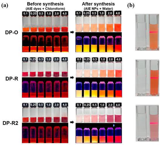 The UV–Vis absorption spectra of the DP-O, DP-R, and DP-R2 AIE NPs and the PL spectra obtained using different AIE dye concentrations are shown in Figure 4. All the UV–Vis absorption spectra of these AIE NPs, which were acquired using a concentration of 0.5 mg/mL, showed gradually increasing intensity as the wavelength shortened (Figure 4a). To obtain the optimal dye concentration, i.e., the highest PL intensity, for the preparation of the AIE NPs, the PL intensities of the AIE NPs with different DP-O, DP-R, and DP-R2 AIE dye concentrations were compared (Figure 4b,c). The amounts of the respective dyes used were 0.1, 0.25, 0.5, 1, 2, and 4 mg in the preparation of the different test samples of AIE NPs. The measurement results in the case of each of the three dyes showed that the higher the dye concentration, the more red-shifted the emission wavelength. The optimized dye concentrations were found to be 2 mg/mL for DP-O, 1 mg/mL for DP-R, and 0.5 mg/mL for DP-R2, respectively. It was considered that greater red shifting was observed as the concentration increased for all the three dyes because more molecules were involved in π–π stacking interactions, and this promoted intermolecular charge transfer. In addition, the long-wavelength shoulder of the emission band gradually increased as excimer formation was promoted with the increase in dye concentration. The photographs of the AIE dyes (before NP synthesis) and of the AIE NPs (after NP synthesis) in Figure 5a also demonstrate that the magnitude of the red shift increased with the dye concentration. Furthermore, it is apparent that although the AIE dyes dissolved in chloroform were weakly fluorescent, the fluorescence was rendered much more intense, thanks to the RIR mechanism, after the incorporation of the dye within the NPs. To verify the presence of small-sized particles in the AIE NP solutions, a laser was irradiated from the left after placing pure water in a cuvette on the left of another cuvette containing the prepared AIE NP solution, and the Tyndall effect was observed (Figure 5b). The Tyndall effect is a phenomenon in which light is scattered by colloids with small particle sizes. Thus, the formation of AIE NPs was verified indirectly by observing the Tyndall effect upon transmitting a laser through solutions containing the prepared AIE NPs [38].