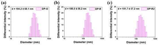 DLS analysis was performed to directly determine the particle size distributions of the three different AIE NPs prepared using the optimized synthesis method and dye concentrations, and the results are shown in Figure 6. All the samples had similar particle sizes and uniform size distributions: the measured average particle sizes were 194.2 ± 68.1 nm for DP-O, 186.0 ± 56.2 nm for DP-R, and 181.7 ± 57.2 nm for DP-R2, respectively.