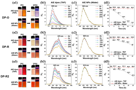 Fluorescence stability of DPP-based AIE dyes and AIE NPs solutions. (a1–a3) photographs of fluorescence intensity at 0 and 25 h, (b1–b3) PL spectra of AIE dyes over time, (c1–c3) PL spectra of AIE NPs over time, and (d1–d3) Comparison of PL intensity of AIE dyes and AIE NPs. (Excitation wavelength = 365 nm).