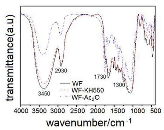 3.5.1. Fourier Transform Infrared Analysis (FTIR) of Wood Flour
