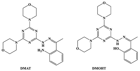 The two ligands DMAT and DMOHT were prepared following the reported method [55]. The first and second chlorine atoms of the 2,4,6-trichloro-1,3,5-triazine (cyanuric chloride) were replaced in one step by two morpholine. Then the third chlorine atom was replaced by hydrazine under reflux for 4–6 h (Scheme 1). Finally, the hydrazine derivatives were condensed with 2-amino-/or 2- hydroxy-acetophenone in the presence of a few drops of acetic acid and ethanol as a solvent in order to give the target products in high yields and with high purities, as observed from their NMR spectra, which are in good agreement with the reported data (Figures S1 and S2; Supplementary material).
