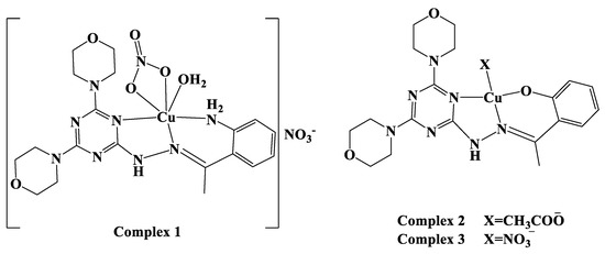 Motivated by the facts outlined above, the current study focuses on the synthesis and spectroscopic characterizations of three new Cu(II) complexes with the 2-(hydrazino)-4,6-disubstituted-s-Triazine ligands shown in Figure 1. X-ray diffraction of single- crystal, Hirshfeld, and spectroscopic analyses were used to investigate the structural characteristics of the synthesized complexes. Furthermore, the antibacterial, antioxidant and anticancer activities of these complexes were studied and compared with free ligands.
