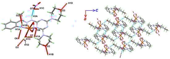 The molecular packing of complex 1 was controlled by strong N-H…O and O-H…O hydrogen bonding interactions (Table 2). The presentation of these contacts is shown in the left part of Figure 4, while the right part of the same figure presents the packing along the ac plane. The N-H of the amino groups and the O-H of the water molecule are the hydrogen bond donors, while the hydrogen bond acceptor sites are the oxygen atoms that are either from the nitrate or morpholine moieties.