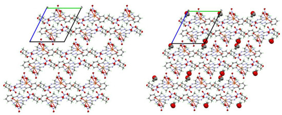 The packing structures of complex 1 with (left) and without (right) the disordered ethanol molecule.