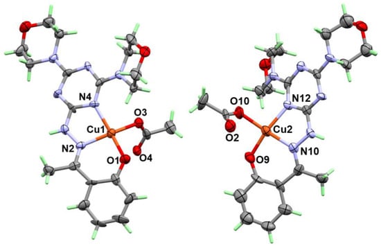 On the other hand, s-Triazines play integral roles as a organic ligands in coordination chemistry [21,22,23,24,25,26,27] and as organic building units in supramolecular chemistry [28,29,30]. Another advantage is the synthetic versatility of s-Triazine derivatives which comes from the simple and inexpensive way they can be prepared from cyanuric chloride [31,32,33]. s-Triazines exhibit a wide range of industrial and agricultural uses, including in the preparation of resins, dyes for textiles, removal agents for sulfide and in herbicides [34,35]. In addition, they have an essential position in medicinal chemistry since they are used in the manufacturing of many drugs with various pharmacological activities [36,37]. Additionally, Schiff bases containing s-Triazine have a wide range of biological activities, especially as promising anticancer agents [38,39,40,41]. Over and above these, Cu(II) complexes with s-Triazine hydrazone derivatives have interesting magnetic and catalytic applications [42,43,44,45,46], as they play a catalytic role in numerous chemical and biological processes, concurrently performing an essential function in the immune system, nutrient metabolism, as well as serving as a metal cofactor bound to protein in the living body. Although copper is a trace metal, its numerous complexes are now gaining attention because of their prospective uses as antiviral, antibacterial, anti-inflammatory drugs with decreased unwanted effects and as anticancer medicines [47,48,49,50,51,52,53,54].