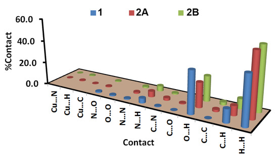 Hirshfeld maps are characteristic of each crystal, and our analysis of these maps gave us quite a clear idea about the intermolecular interactions included in the molecular packing within a crystal. The distribution of the different contacts for complexes 1 and 2 are presented in Figure 8. In the case of complex 1, the percentages of the O…H, H…H and H…C contacts are the highest. Their percentages are 37.2, 43.0 and 11.8%, respectively. Analysis of the fingerprint plot of complex 1 revealed that both O…H and H…H are short contacts, as these interactions appeared as sharp spikes (Figure 9). The regions included in the H...H and O…H interactions are labelled in the dnorm map as regions A and B, respectively (Figure 10). These regions are marked with a red color, further indicating interactions shorter than the vdWs radii sum of the interacting atoms.
