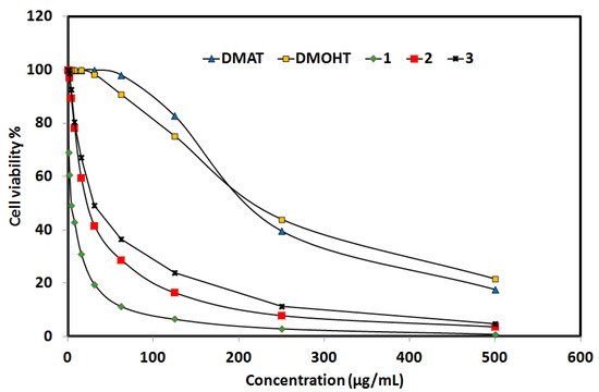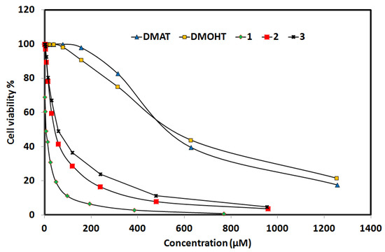 Additionally, the degree of inhibitory cytotoxic activity against normal human lung fibroblast MRC-5 cells was determined and the results were collected in Tables S9–S13 and presented graphically in Figure 14. The CC50 values for indicating the degree of cytotoxic activity are 716.04 ± 49.36 µM and 999.90 ± 57.13 µM for the free DMAT and DMOHT, respectively. For complexes 1–3, the CC50 values are 37.67 ± 2.97 µM, 101.47 ± 7.01 µM and 172.96 ± 11.98 µM, respectively. Based on these results, complex 1 shows the highest degree of cytotoxicity against the MRC-5 cell line. In this regard, the selectivity index (SI) was calculated as the ratio of cytotoxic effect on the normal cell line to the cytotoxic effect on the cancer cell line. The SI results revealed that complex 1 had the highest value (6.34) when compared with complexes 2 (0.72) and 3 (2.97). The SI values for the free ligands DMAT and DMOHT are 1.30 and 1.77, respectively. Hence, complex 1 is the best candidate for consideration as an anticancer agent against lung carcinoma (Table 8).
