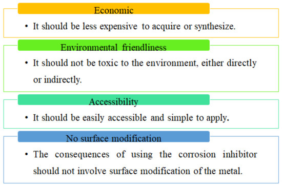 The selection process of corrosion inhibitors has undergone several transformations over the years [4,5]. The expansion of research and development has given way to the development of a new set of corrosion inhibitors to meet the knowledge and functionality gaps created by the existing ones [10]. Such knowledge gaps that have been addressed in the research and selection processes come under the field of sustainability [11]. Years back, the development of corrosion inhibitors was focused on the use of inorganic salts or metal oxides, followed by a shift to organics, which has also received wider criticism in recent years due to the presence of unacceptable levels of heavy metals and other toxic compounds, poor solubility (especially in polar electrolytes), and reduced stability under critical conditions [12,13]. The corrosion inhibitors that have been in high demand in recent times are those that meet the conditions shown in Figure 2 [14]. In this respect, fruit and vegetable extracts serve as excellent candidates as non-toxic and sustainable corrosion inhibitors. Hence, the current study seeks to evaluate the current advancements, challenges, and opportunities in the field of corrosion inhibition with fruit and vegetable extracts.
