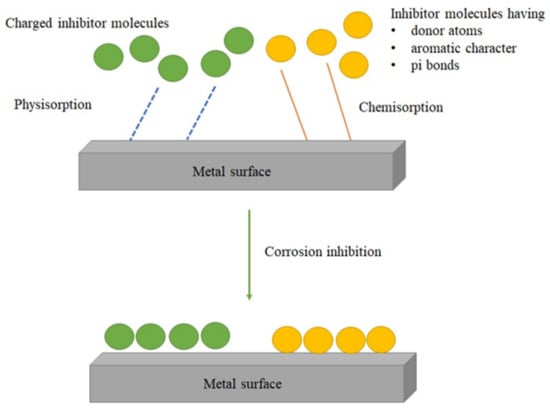 Corrosion inhibitors should meet sustainability requirements, which implies the tendency for such inhibitors to meet the present and future demands without the alteration of useful factors [35]. The inhibition action is considered to take place via physisorption or chemisorption. The weak polar interaction between the charged metal surface and inhibitor molecules results in physisorption, whereas in the case of chemisorption, the molecules are held onto the metal surface with strong electrostatic forces (Figure 3) [37].