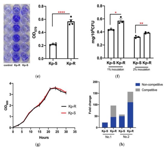 To evaluate the relationship between biofilm-forming ability and the drug-resistant phenotype, we quantified the biofilm formation of Kp-S and Kp-R by staining the strains with crystal violet and measuring OD 570 (Optical density at 570 nm) (Figure 1e). We found that the OD 570 value of Kp-R (0.419 ± 0.06) was significantly higher than Kp-S (0.0695 ± 0.01), confirming that Kp-R produced more biofilm than Kp-S.