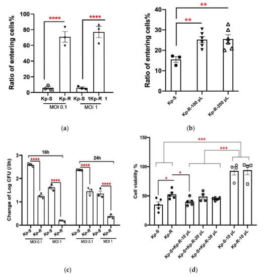 Lung epithelial cell line A549 was infected with Kp-R and Kp-S to explore the relation between the drug-resistant phenotype and pathogenicity [21]. The results showed that under a low infection dose (multiplicity of infection, MOI 0.1 and 1), the efficiency of bacterial entry into A549 cells was significantly higher in the Kp-R groups (Figure 2a).