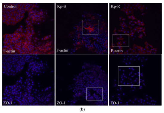 The cytoskeleton can be manipulated by microbial pathogens to facilitate productive infection. Since Kp-R and Kp-S affected the viability of A549 cells, we stained the cytoskeleton F-actin and the tight-junction protein zonula occludens 1 (Zo-1). As shown in Figure 3a, the significant destruction of cytoskeleton morphology and a loss of integrity of tight junctions were observed after Kp-R and Kp-S infection for 12 h. At 16 h after Kp-R and Kp-S infection, an increased reduction in Zo-1 expression was detected and a more severe disorganized cytoskeleton was seen, as shown in Figure 3b. Comparisons between the cytoskeleton and tight junctions of the two infected groups gave the same conclusion as the CCK-8 assays, which revealed that Kp-S caused more severe damage to A549 cells than Kp-R.