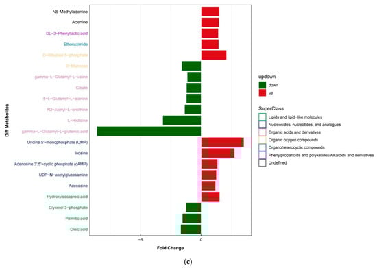 Unbiased metabolomic profiling of extracellular secretions showed differences of the two strains, as illustrated by a pie chart (Figure 4a). A total of 306 metabolites were identified by liquid chromatography–tandem mass spectrometry (LC–MS/MS) (p < 0.05) (Table S2). After normalizing to total peak intensity, the processed data were subjected to a multivariate analysis of orthogonal partial least-squares discriminant analysis (PLS-DA) for negative or positive ion labels between the two strains (Figures S2 and S3). When analyzing the differences in metabolite expression in positive-ion mode, 93 metabolites significantly increased and 94 decreased (p < 0.05) (Figure 4b, Table S3); whereas 89 metabolites significantly increased and 91 decreased in negative-ion mode (Figure 4c, Table S4). When KEGG enrichment analysis (Kyoto Encyclopedia of Genes and Genomes, http://www.kegg.jp/ accessed on 17 September 2020) was applied, 16 predominant molecular species were found produced by Kp-R, including inosine, adenine, adenosine, adenosine 2′, 3′-cyclic monophosphate, adenosine 3′, 5′-cyclic phosphate (cAMP), adenosine 3′-monophosphate, choline, citrate, d-mannose, d-Ribulose 5-phosphate, glycerol 3-phosphate, inosine, l-Arginine, l-Histidine, l-Leucine, l-Proline and N2-Acetyl-l-ornithine.