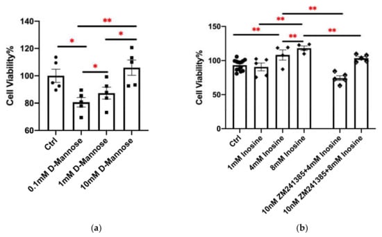 The effects of inosine and D-mannose on A549 cell viability after 3 h stimulation. (a) A549 cell viability was evaluated after treatment with inosine at various concentrations (1, 4, 8 mM), with or without pre-treatment with 10 nM ZM241385 for 0.5 h. (b) A549 cell viability was evaluated after treatment with D-mannose at various concentrations (0.1, 1, 10 mM) for 3 h. Y-axis represents cell viability. (*, p < 0.05, **, p < 0.01, Mean ± SE; Data analyzed by the Student’s t-test. The experiments were performed in triplicate).