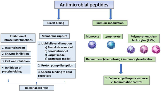 The human β-defensins are of four types (HBD 1–4) and are composed of up to 45 residues that are expressed by the epithelial skin cells, and psoriatic scales and the synthesis of these peptides can be induced by cytokines such as TNF- α and IL-1 β [36,37]. Human host defensins can protect humans from microbial infections but show different levels of expression at every stage of human growth. For example, cathelicidin LL-37, is usually detected in the skin of new-borns, whereas human beta-defensin 2 (HBD-2) is often expressed in the elderly [67]. Human defensin peptides are present in several parts of the body, including the skin, eyes, ears, mouth, respiratory tract, lung, intestine, urethra, tracheal epithelium, and at elevated levels (HBD-2 in particular) in human keratinocytes exposed to pathogenic bacteria [24,68]. AMPs from human breast milk can play an important role in decreasing the morbidity and mortality of breast-feeding infants [69]. A recent study showed that the levels of AMPs were similar in the breast-milk-fed preterm infants with and without late-onset neonatal sepsis, but since preterm infants with late-onset neonatal sepsis consumed significantly less breast milk, the levels of milk AMPs were low. This indicates that the concentrations of lactoferrin and defensins in preterm breast milk have antimicrobial activity against neonatal pathogens [69]. Dairy is an important source of AMPs, which are produced by the enzymatic hydrolysis of milk, of which lactoferricin B (LfcinB) is well-known for its antimicrobial properties that affect intracellular activities, leading to bacterial inhibition [38]. In addition to antimicrobial activity, cathelicidins and defensins have also been shown to affect immune regulation, apoptosis, and wound healing [39]. The mechanisms of action of antimicrobial peptides are summarised in Figure 2.