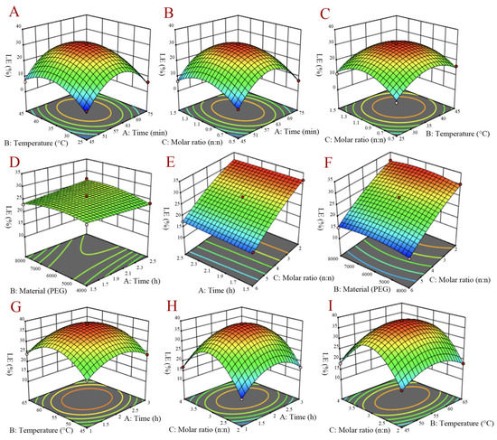 3D-response surface of interaction between random two-factor on curcumin β-cyclodextrin inclusion complex (A–C), curcumin solid dispersion (D–F), and curcumin phospholipid complex (G–I).