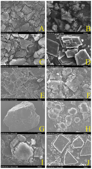 The SEM images of curcumin β-cyclodextrin inclusion complex, curcumin solid dispersion, and curcumin phospholipid complex: (A) curcumin, (B) β-CD, (C) physical mixture of β-CD and curcumin, (D) CUR-β-CD, (E) PEG-6000, (F) physical mixture of PEG-6000 and curcumin, (G) CUR-PEG-6000, (H) HSPC, (I) physical mixture of HSPC and curcumin, (J) CUR-HSPC.