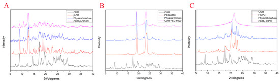 The XRD curves of curcumin β-cyclodextrin inclusion complex (A), curcumin solid dispersion (B), and curcumin phospholipid complex (C).