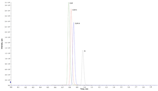 The selectivity of the assay was verified by comparing the MRM chromatograms of the drug-containing samples and the blank samples. No interferences from the blank beagle dog plasma samples were observed at the corresponding times for CUR, CUR II, CUR III, and IS (Figure 6). The retention times of CUR, CUR II, CUR III, and IS were 0.73, 0.77, 0.80, and 0.99 min, respectively.