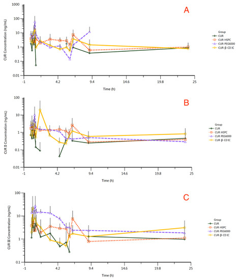 The average concentration of CUR (A), CUR II (B), and CUR III (C) in beagle dogs’ plasma of all groups within 24 h after administration (values reported as mean ± S.D., logarithmic representation, n = 6).