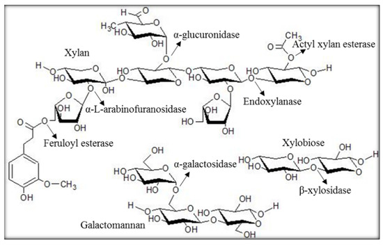Hemicellulose is the second-most abundant polysaccharide type, composed of pentoses, such as xylose, and hexoses, such as glucose [13]. It is an important plant-derived polysaccharide with applications in the development of bio-based chemicals, biofuels, pharmaceuticals, and prebiotics [14,15]. Hemicellulose is heterogeneous and comprises different subunits, such as glucomannans, arabinoglucuronoxylans, xyloglucans, mannans, xylan, and arabinogalactans. The composition of hemicellulose subunits is varied among the various biomass sources [16,17,18]. For instance, hardwoods are essentially composed of xylans in the form of acetylated xylan and glucomannans [19]. The enzymatic hydrolysis of hemicellulose involves various hemicellulases, such as xylanases (endo- and exo-xylanases); β-xylosidases; and accessory enzymes, such as arabinofuranosidases and acetyl xylan esterases (Figure 1) [20]. Xylanases act on the xylan chain to release shorter chains, such as xylooligosaccharide and xylobiose, which are then hydrolysed to xylose units by β-xylosidase [21]. The xylan backbones are often substituted with different side chains, such as acetyl, 4-O-methyl glucuronic acid, feruloyl and ρ-coumaroyl, and arabinosyl residues [14,22]. Acetylation, like other substitutions, restricts the access of xylanases, resulting in reduced release of sugars available for fermentation [23]. Hence, the removal of xylan substitutions is crucial for improved hydrolysis of hemicellulose. The treatment of LCB with accessory enzymes has been shown to increase hydrolysis efficiency and improve the activity of backbone depolymerizing enzymes [23]. For example, the synergetic action of acetyl xylan esterase from Neocallimastix patriciarum and xylanase (XynA) released higher amounts of reducing sugars compared with hydrolysis with xylanase alone [24].