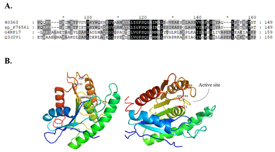 The annotation of protein features was achieved with Multiple Sequence Alignment (MSA). Multiple sequence alignment was performed with ClustalO hosted on the EMBL-EBI website using the default algorithm (https://www.ebi.ac.uk/Tools/, accessed on 10 March 2022). The amino acid sequence of Gene_id_40363 was aligned with the amino acid sequence of the top hit protein when queried against the swissprot database and closely related proteins identified from the constructed phylogenetic tree [25]. The annotation and display of the sequence alignment were performed in GeneDoc (version 2.7). The molecular weight and isoelectric point (pI) of proteins were determined using the ProtParam tool available on ExPASy (https://web.expasy.org/protparam/, accessed on 15 March 2022). The three-dimensional (3D) model of Gene_id_40363 was generated with homology modelling performed in Iterative Threading ASSEmbly Refinement (I-TASSER; https://zhanglab.ccmb.med.umich.edu/I-TASSER, accessed on 15 March 2022) using multiple sequences of crystalised proteins as a template [61,62]. The modelled structure was validated based on the C-score (confidence score), TM-score (template modelling score), and RMSD (root-mean-square deviation), as previously described [62]. The final protein model was visualised and annotated in PyMOL version 2.0 (Schrodinger New York, NY, USA).